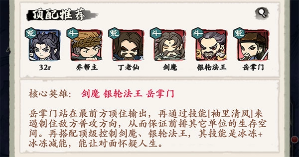 核心英雄组合为剑魔、银轮法王与岳掌门。战斗中,岳掌门需顶在队伍最前排承担主要伤害,同时利用其技能“袖里清风”限制敌方普通攻击的目标方向,以此为前排其他友方单位创造更安全的生存环境。此外,搭配拥有强力控制能力的剑魔和银轮法王——二者技能可实现冰冻效果叠加与冰冻状态下的减能机制,这套组合足以让敌方陷入难以应对的困境。