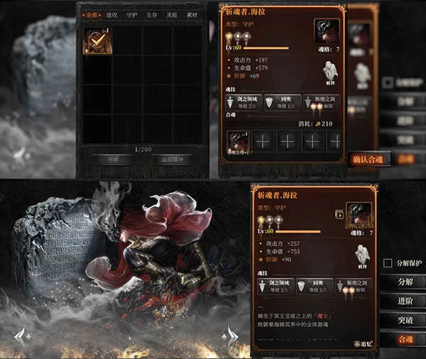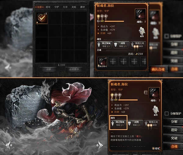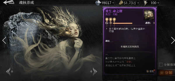 分解:将不需要的魂核进行分解可以获得虚忆粉尘、灵魂碎片和古魂碎片,这些材料可用于魂核的进一步培养。