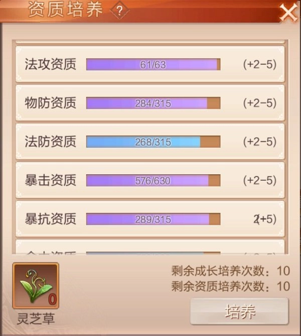 2、属性培养:若对宠物的某项资质不太满意,可使用灵芝草来进行针对性的培养,但要留意的是,每只宠物仅能培养十次。