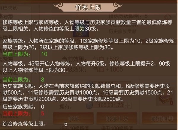 修炼上限:家族等级、角色等级和历史家族贡献都会对当前的修炼等级上限产生影响,具体的上限由其中最低的等级上限来确定。