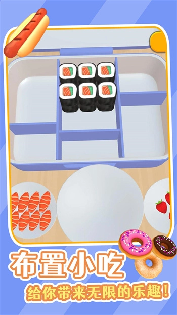 1、玩家可以自由选择自己想要制作的食材,展示自己的烹饪技巧,根据自己的想法设计不同形状的便当。2、美味的便当游戏的每个级别的玩家都可以充分发挥想象力,混合不同的食材,生产过程也是一个非常治愈的过程。
