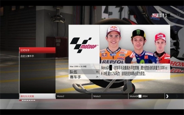 (2)大奖赛:在摩托车大奖赛里挑选其中一场赛事来开展游戏体验。