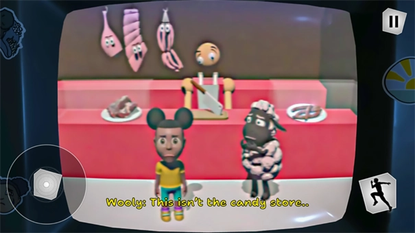 2、第二章里,我们跟随阿曼达和小羊来到了街上,看望奶奶,知道奶奶不吃肉,同时有肉店和冰淇淋点,带一点冰淇淋吧,但是不是怎么的,冰淇淋不见了,只有肉店,然后进入肉店之中,这个时候的小羊已经很害怕了,似乎想要诉说着什么,输入meat,结束第二章。