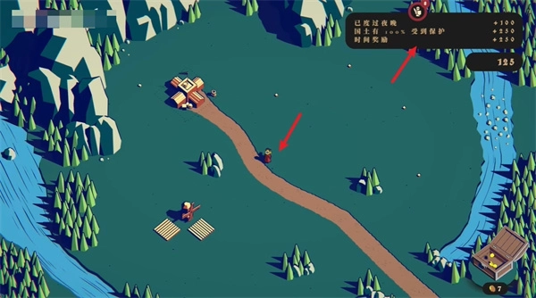 (3)强力塔与玻璃炮流派需在第一天于左侧建造一座箭塔以抵御敌人;战马搭配重甲的组合则无需建造箭塔(不过选择战马时需要特别说明,战马通常需配合重甲这一王权,这里也选择了重甲),第一天即可解锁第一座渔场(解锁时要先点战斗技巧哦)。