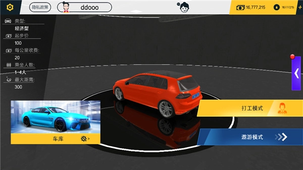 4、此时你已经有3辆车了,按照前三个步骤,一般只需要一小时。跑几单凑够1w块,选遨游模式。进入游戏后不要相信1000km一个金币。这游戏bug之一就是遨游模式实际1km1金币。跑个1000km实际获得1000币,把车和场景买完绰绰有余。