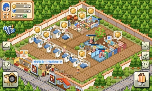 1、游戏操作跟其他模拟经营类游戏差不多,刚进入游戏也会有贴心的操作引导。NPC苏菲亚会带领玩家以详细的步骤操作和明确的箭头及文字说明,来了解游戏的操作方式,玩家一开始不知道该怎么做时,只要跟着教学任务慢慢从基础打造就可以了。玩家在游戏中只要点击屏幕相应的地方就会触发相应的功能。如果你点击游客或者房间上面的符号也会触发各种各样的事件,对度假村进行升级,扩大土地面积,置办房间装扮度假村,一切都十分简单明了。