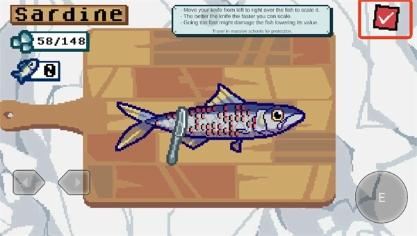 归航后进入后厨处理环节,核心亮点是真实的刮鱼鳞模拟。玩家需握紧虚拟刮鳞刀,根据鱼身弧度调整滑动节奏,从左至右均匀发力刮除鱼鳞,既要保证去鳞干净,又需避免力道过大损伤鱼肉——残留红疙瘩或反复刮动都会降低食材品质与售价。不同鱼种的鱼鳞硬度不同,需搭配对应等级的刀具,满级刮刀可实现快速高效去鳞,大幅提升餐厅运营效率。除刮鳞外,还可对渔获进行解剖、去内脏等处理,获取不同部位食材,处理技巧直接影响后续菜品口感。