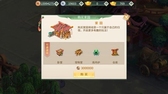 家园里包含卧室、宠物室、炼丹炉与仓库这四种功能玩法。