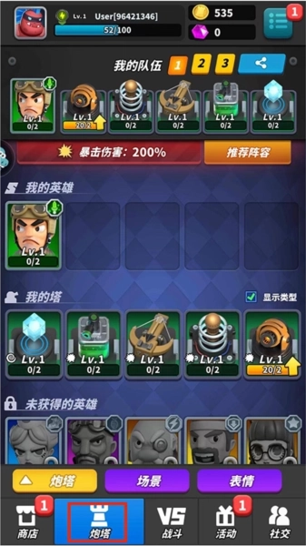 3、进入【炮塔界面】后,玩家能够在此处进行阵容搭配,查看自身拥有的英雄信息,对塔进行升级操作,还可以管理场景和表情相关设置。