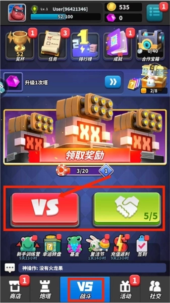4、打开【战斗界面】后,能看到玩家的奖杯数量、任务、排行榜、成就,还能领取奖励。其中,【VS】是单人匹配模式,【5/5】是好友组队模式,挑选想要的模式就能开启游戏对战,下面以【VS】模式为例进行说明。