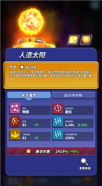 人造太阳具备强劲的溅射伤害效果,且该伤害能够叠加;当防御塔数量分别达到1座、4座、7座时,会依次激活溅射功能并提升攻击速度。再搭配上反应堆提供的增益BUFF与重构带来的增伤BUFF,其整体输出能力将变得极为出色。