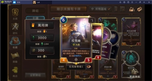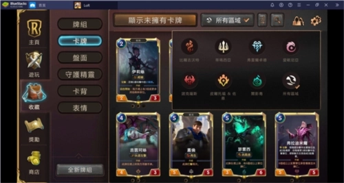 在游戏主界面里,点击「收藏」→「卡牌」按钮,就能查看当前已拥有和未获得的卡牌。现阶段,《符文之地传说》一共有440张不同的卡牌,它们被划分为「比尔吉沃特」(62张)、「德玛西亚」(63张)、「弗雷尔卓德」(63张)、「艾欧尼亚」(63张)、「诺克萨斯」(63张)、「皮尔特沃夫&祖安」(63张)以及「暗影岛」(63张)这7大地区。一套卡组中最多只能包含2个不同地区的卡牌。