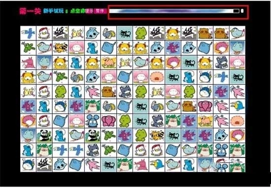 2、点击“开始”按钮后,会进入连连看的主界面。界面最上方有一个持续减少的时间进度条,这代表游戏的总时长。需要在进度条消失前消除所有宠物头像,若未完全消除则游戏失败。如图所示: