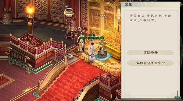 2、功勋值的使用规则:当积累的功勋值达到下一等级官职的要求时,可点击【前往晋升】按钮,前往国王处进行官阶晋升操作,从而获取更高级别的官阶属性、专属称号以及相应的俸禄奖励。