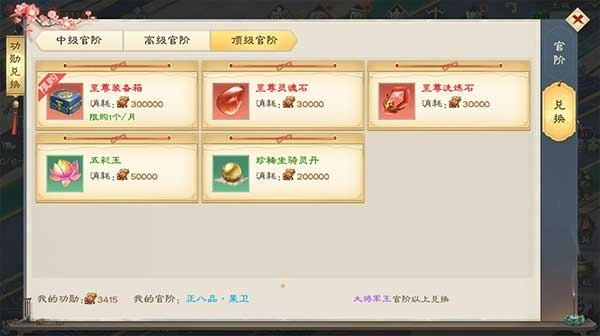 5、功勋商店中,不同官阶职位能够兑换属性各异的灵药,官阶越高,可兑换的灵药属性就越出色。使用功勋值完成兑换后,要是剩余功勋值达不到当前官职的要求,就会触发官阶降级机制。
