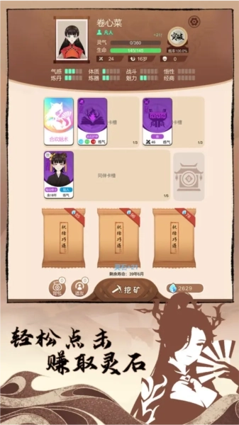 《卡包修仙》是一款竖版放置挂机抽卡类游戏。在游戏里,玩家需通过持续挖矿获取大量灵石,进而用灵石购买各类卡包、抽取心仪卡牌来提升自身实力。另外,这里提供的是修改版本,已移除广告内容,玩家可直接跳过广告领取游戏奖励。感兴趣的话,就快来体验吧!