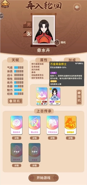第一局可以随意玩来熟悉词条,要是死了就直接开第二局,选不死长生诀这个流派(主加经商和气感),然后就可以开始正式开局了。