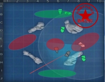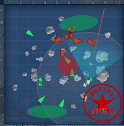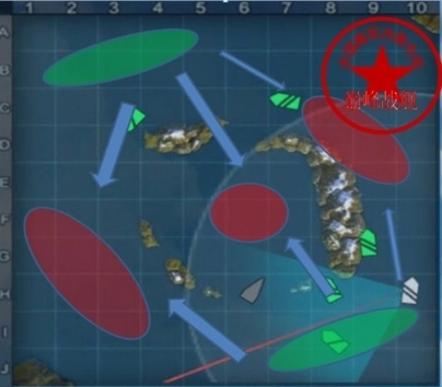红色椭圆形区域是双方推荐的交战区域,也可当作驱逐点灯的区域,具体要根据实际情况来定。由于这张图比较简单,也是低级场里较为常见的地图,所以就不多做解释了。