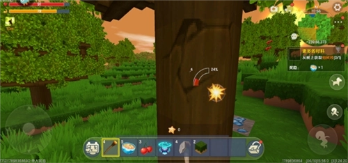 点击快捷栏里的斧子,把它握在右手上,然后靠近一棵树的树干,用手指按住树干上的方块,这时会出现进度条,等进度条走到100%,树干就被顺利砍下来了。