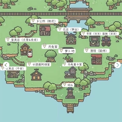 1、地图解锁的顺序依次为:村公所、月兔家、萝卜地、码头。完成上述解锁后,再按照顺序解锁长颈鹿家、乌龟家、花店、工具店、茶馆面摊、酒吧。