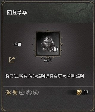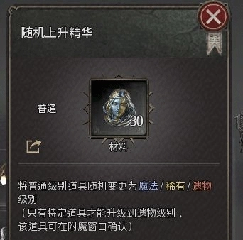 第二步,用随机上升精华碰下运气:要是直接出了遗物级装备就停手——毕竟遗物装没法改属性,而且属性通常都不错;要是出的是稀有级,就看看属性合不合心意,不满意的话就回到第一步重新来;不过按常理,大概率会出魔法级装备。