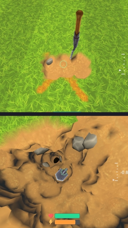 3、挖掘需要消耗体力,受到伤害会损失生命值,你还得完成吃喝睡这些事。
