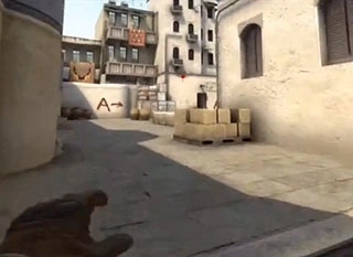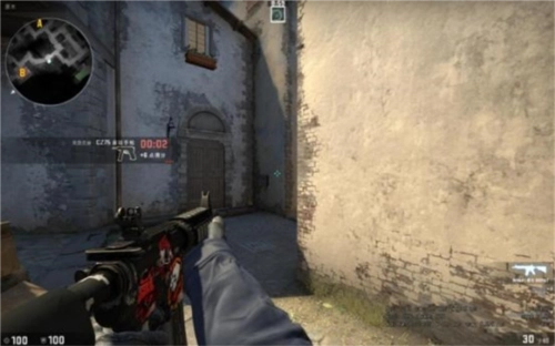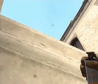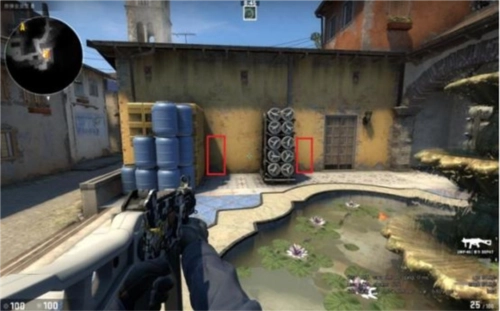 当T进攻B点断后的时候,站这里比贴墙好的原因是因为地图的改动,香蕉道门口两边都可以站人,此时如果对手稍有头脑就会先看右边(图中准星瞄准的地方)再来检查左边,此时你完全可以提前半个身位知道他的动向。