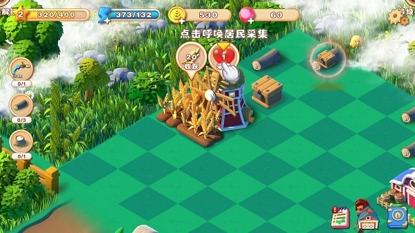 7、通过累计合成能够建造出对应的加工建筑,点击采集提示按钮可以引导居民前往田地或物品处获取特殊物品。