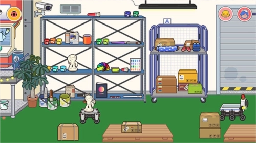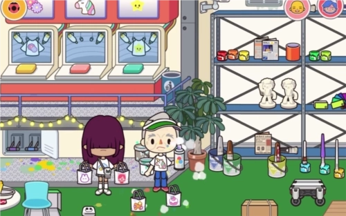哇,又遇到一个全新的场景啦!这里面居然还能画画呢!不仅有给玩具染色的工具,还有一块大大的画板,太有意思啦!