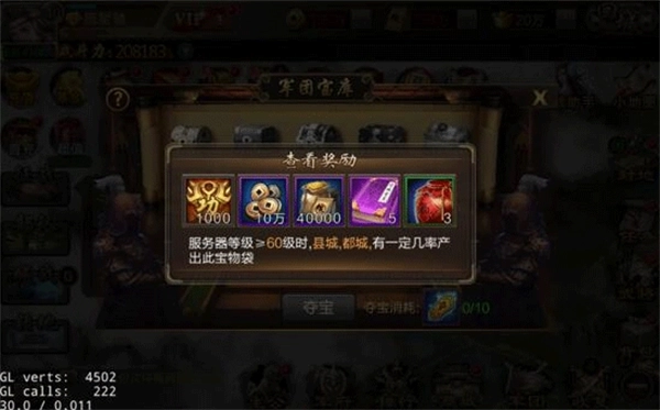 军团宝库的产出依据是军团占领城池的数量与规模,各类宝箱由此生成;消耗令箭就能参与夺宝,宝箱内包含大量铜钱和粮草。