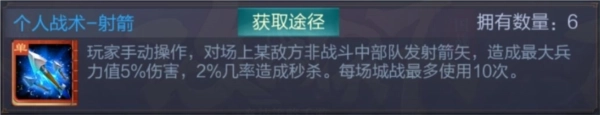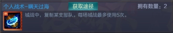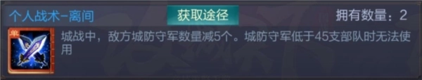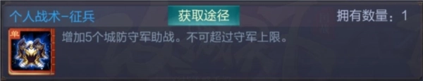 使用条件:在城战的战斗阶段,仅能对守军数量尚未达到上限的己方城池进行使用。