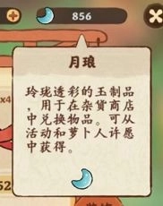 A7:这个是月琅。它可以在游戏下方目录栏的“游乐-杂货-材料”里,用来兑换卷轴、建筑材料、加速符、食材、鱼饵之类的东西,另外在“材料”分类下的“装饰”选项中,还能兑换乙丙级的装扮。