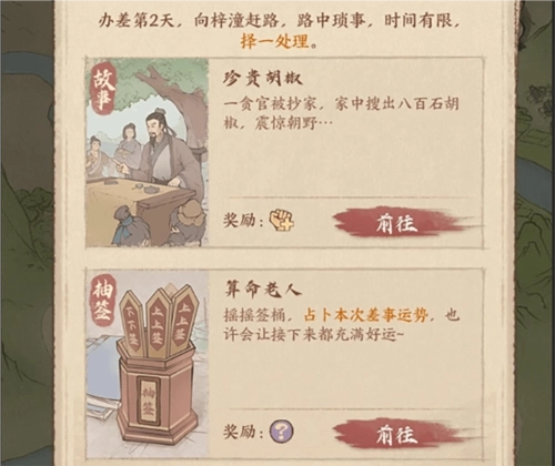 除此之外,这座城里的良田区域可能还藏着抉择事件、驿站事件等不同类型的事件。在面对这些事件做出选择时,需要根据自身需求仔细考量——比如是希望提升差事的成功率,还是一心想要获取更多奖赏。值得注意的是,每一个选择都会对最终的差事评级产生影响哦!