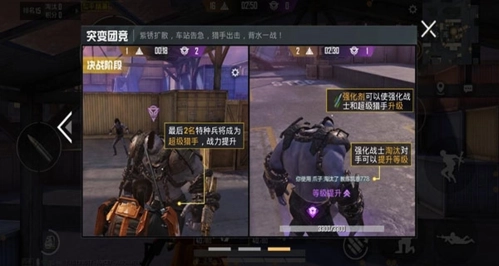 突变团竞的阵营分为两类:一类是特种兵与超级猎手,另一类是疾行战士和强化战士。每局开始前有20秒的时间供玩家挑选防守点位,随后会有三名玩家转化为强化战士。强化战士攻击到特种兵后,就能把对方变成疾行战士,同时强化战士自身也能升级。当场上的特种兵仅剩下最后两人时,这两人会成为超级猎手。强化战士的获胜条件是感染所有特种兵和超级猎手,而特种兵的目标则是撑到游戏时间结束,或者消灭所有强化战士。由于强化战士的生命值很高,且被他们攻击到就会被感染,因此在游戏开始前的20秒里,玩家需要找一个合适的地方进行防守。