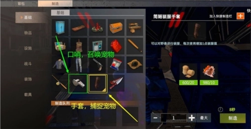 (在初级工作台旁,可以制作驯服手套和口哨)