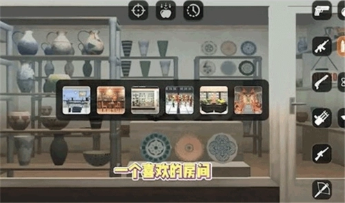 2、进入房间粉碎关卡开始游戏,点击指定位置,可对相关设置进行调整或返回主菜单。