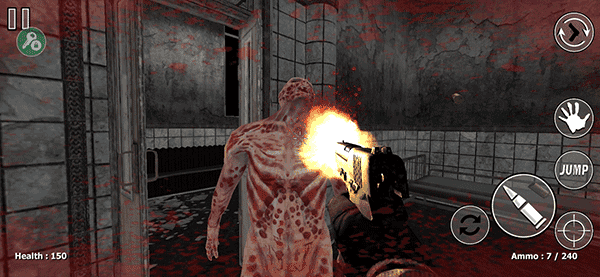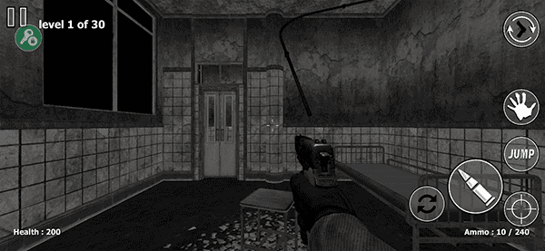 3、游戏里玩家需要用手中的武器消灭僵尸,屏幕左侧用于操控移动,右侧则分布着换弹、射击、跳跃和瞄准的按键。