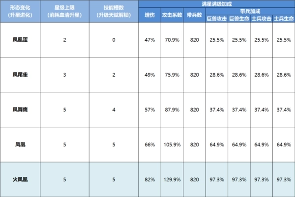 凤凰的形态共有五种,依次为:凤凰蛋→凤尾雀→凤舞鹰→凤凰→火凤凰。其中,除了蛋形态之外,其余四种凤凰形态都能够参与所有部队的战斗,并且不需要出征上阵。