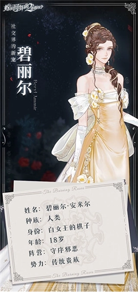这位年轻的淑女是安米尔伯爵的独女。当她抵达罗萨拉城,置身于舞池明亮的灯光之中时,她那双含羞的眼眸、带着笑意的嘴唇,以及温柔的谈吐和得体的礼仪,处处都彰显着她良好的教养与优渥的出身。没错,她是一位真正意义上的传统贵族淑女,她愿为女王奉献自己的一切。