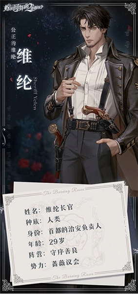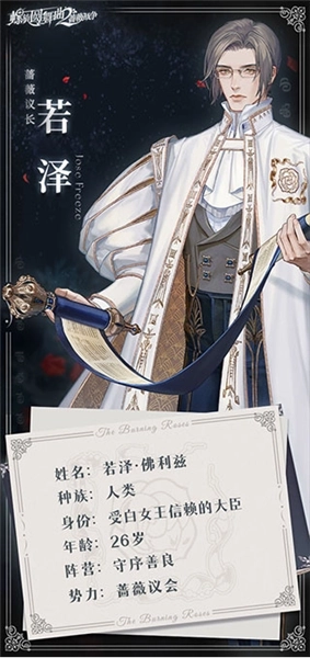 蔷薇议会的议长若泽·佛利兹,是所有渴望获得女王陛下青睐之人首要的拉拢目标。他替白女王接待来自全国的贵族——无论对方是否为人类,也无论场合是光鲜的王廷还是幽暗的地宫。他性格沉稳、头脑理智,对待职责始终尽心尽责。面对贵族们各式各样的讨好,他始终不为所动,那份正直甚至显得有些刻板。直到某一天,他在一位少女的身上,窥见了未来的模样。