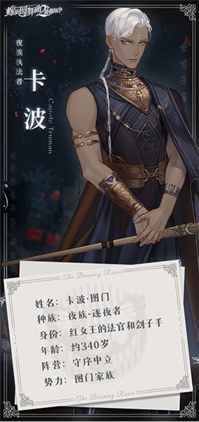 卡波·图门是红女王亲自任命的执法者,任何胆敢触犯律令的人,都无法逃脱他的制裁。他憎恶所有背弃誓言的行为,与此相对应的是,他也从不轻易作出承诺。或许,或许有一天他会对一位少女许下永恒的誓言,届时这个沉默而坚定的灵魂,定会将这份爱延续至他漫长生命的尽头。