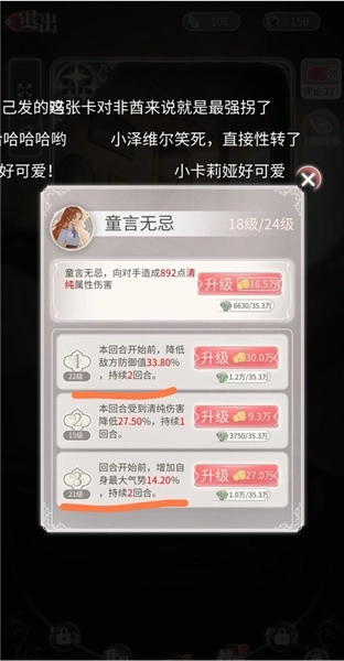 升级那些不带属性的技能时,像这张《马背上的亲王》,它的主技能是增加护盾,优先升级主技能肯定没错;不过第二个技能是“受到活泼伤害降低”,建议尽量不要升级;第一个技能“有几率恢复气势”,要是实在没有其他可升级的技能,再考虑升这个也可以。