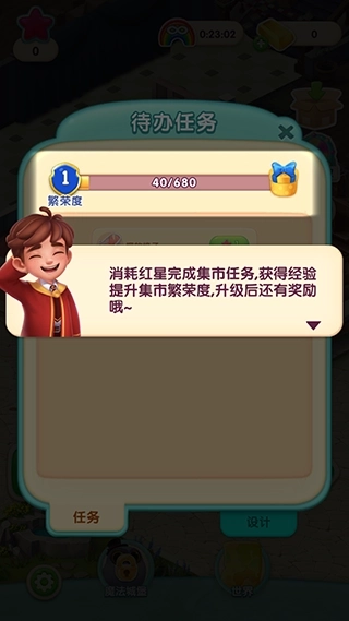 2、在游戏里,核心目标是通过闯过关卡来获取红色心心,而消耗这些红心则能完成集市任务,进而得到经验、繁荣度提升等奖励。