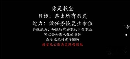 可以查验他人身份,但只能检测出旅行者或恶灵,只有验到教皇时才会显示其真实身份,其他时候验人结果都显示为旅行者或恶灵。在屠边局里,技能冷却时间一般在150秒左右,验人之后通常需要分享自己的验人思路和过程。如果查验到恶灵,不要表现得太明显,避免被对方灭口。当场上有隐狼存在时,也不能完全相信银水——也就是被牧师查验结果为旅行者的玩家。