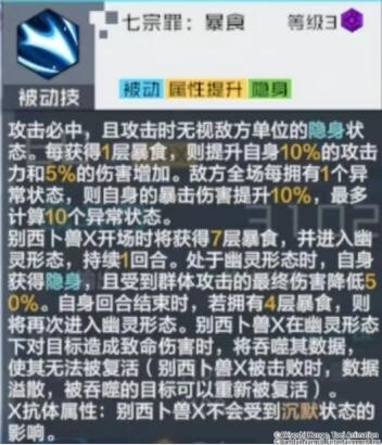 通过巴尔巴兽X的被动技能,能看到当敌方带有暗蚀效果时,它可以为我方攻击力最高的暗属性单位额外提供一次通常技的行动机会,以此有效打击带有暗蚀的敌方目标。因此,我们可以选用通常技伤害较高的别西卜兽X作为主要的输出数码宝贝。