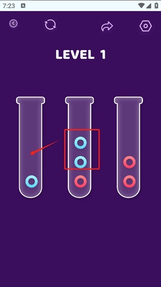 3. 开始排序:进入关卡后,先观察圆环的布局情况,接着通过拖拽滑动的方式,把不同颜色的圆环移动到与其颜色相对应的目标区域。