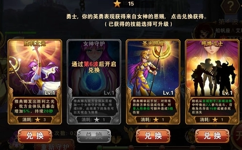 8、强大的圣斗士背后,始终有女神的光环庇护。若想一路披荆斩棘,成功碾压20波敌人,就赶紧收集星星,兑换女神的恩赐来提升战力吧~
