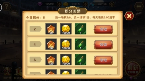 每赢一场比赛可获得2积分,输一场则积1分,所有积分会在每日凌晨5点自动清零。当积分满足奖励领取要求时,就能兑换相应数量的古拉杜纪念章、金币以及高级经验药水。