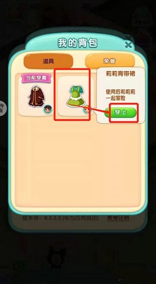 4、在“勇于”选项下方就能看到当前穿着的衣服和其他备选衣物,接着点击另一套衣服,在弹出的小窗口里选择“穿上”按钮即可完成更换。