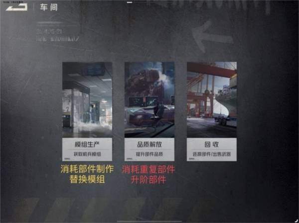 接下来要讲的是核心的车间部分,在这里可以制作可替换的模组,还能进行部件的升阶与还原操作。特别是紫色部件,升阶之后就能安装替换模组,从长远来看,除了氪金大佬之外,紫色部件基本会成为大家的主力选择,不过部件相关的玩法和机制水比较深。